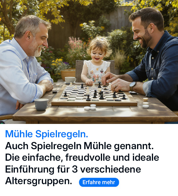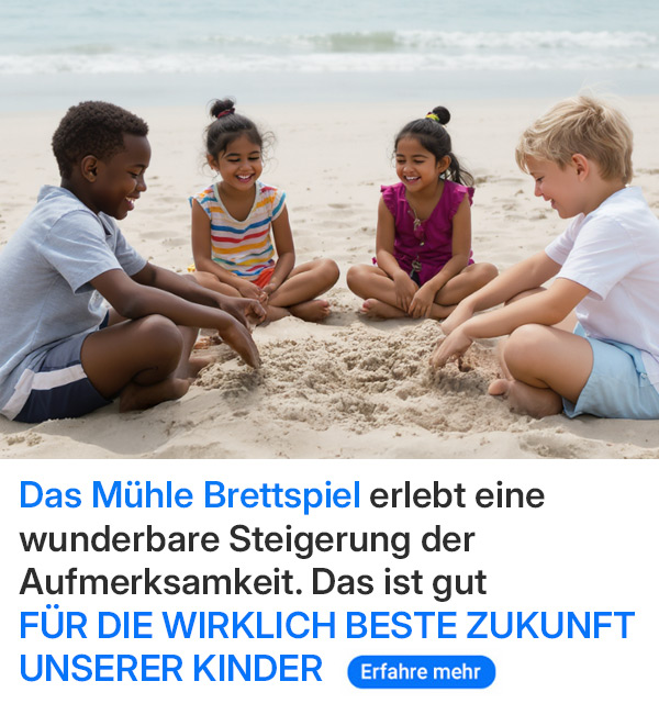 Mühle ist ein Spiel, das Kinder schon sehr früh verstehen und mit Freude spielen können. Es fördert auf einzigartige Weise Konzentration, strategisches Denken und soziale Fähigkeiten – und das alles mit einer Leichtigkeit, die kaum ein anderes Spiel bietet. Das Beste: Jedes Kind auf der Welt kann Mühle ohne großen Aufwand sofort spielen.